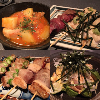 席につくと、お通しの「トマト煮込み」が出てきました。写真は串焼き。鶏とジャガイモに味が良く染みていて美味しいですね。塩加減も丁度いいです。